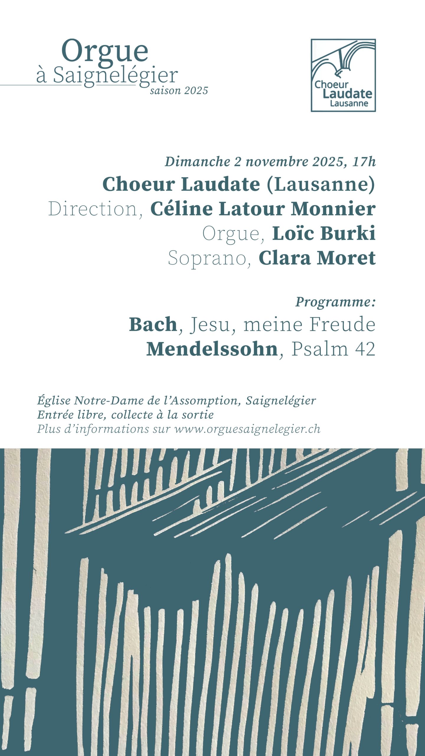 Nous avons le plaisir de recevoir le Choeur Laudate de Lausanne pour le deuxième concert-événement de cette saison de concert. Avec l’organiste Loïc Burki, sous la direction de Céline Latour Monnier, il interprétera des oeuvres du répértoire baroque et romantique pour notre plus grand plaisir.